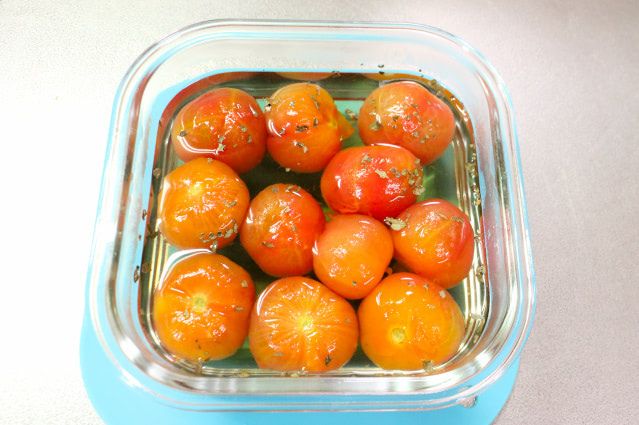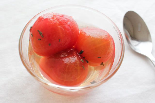 熱いシロップを注ぎ、お好みで乾燥ハーブを振りかけます。今回はトマトと相性がいい、乾燥バジルを少し加えました。