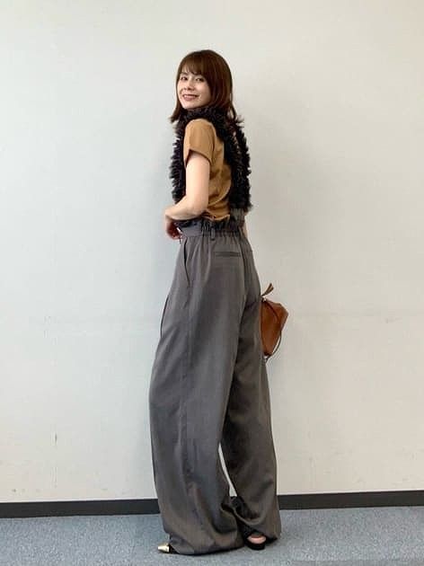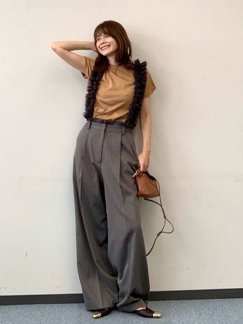 サスペンダーのフリルが顔周りが華やかに。一見シンプルな組み合わせでもアクセサリーなしで奥行きをプラスします。キャメルカラーとグレーの組み合わせが甘さ控えめな秋っぽスタイルを演出。足元やバッグはシンプルなものを選んで大人な女性の印象に。