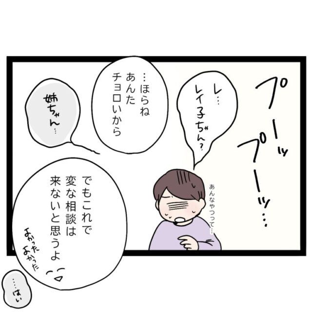 レイ子さんに頼りにされて喜んで相談に乗っていたまさひでさんは、まだ信じられない気持ちと「あんなやつ」呼ばわりされたことで「レ・・・レイ子ちゃん?」とまだ呆然としていました。「ほらね、あんたチョロいから。でもこれで変な相談は来ないと思うよ。」一件落着とばかりに弟に微笑む雅美さんです。