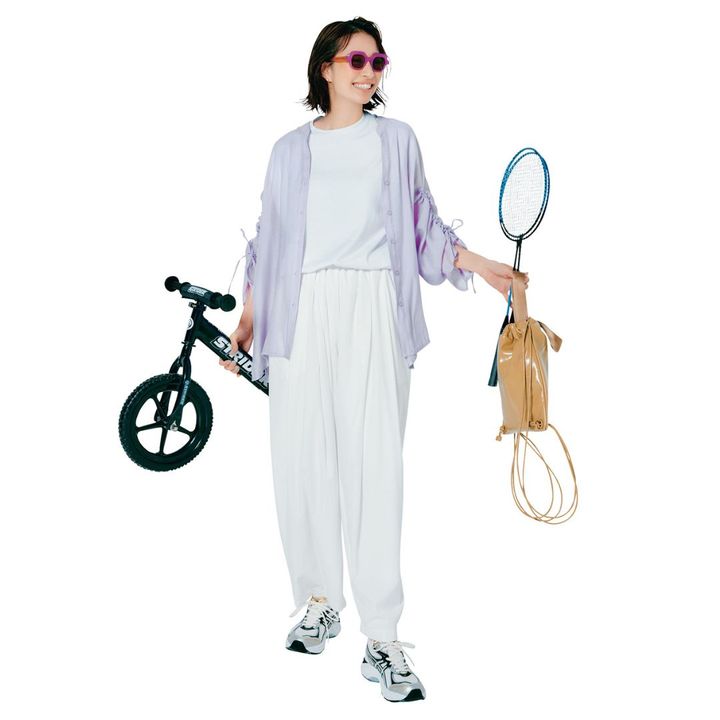 薄パープルのシアーシャツが アクティブコーデに奥行きをプラス。 シルバーのスニーカーで今っぽさを