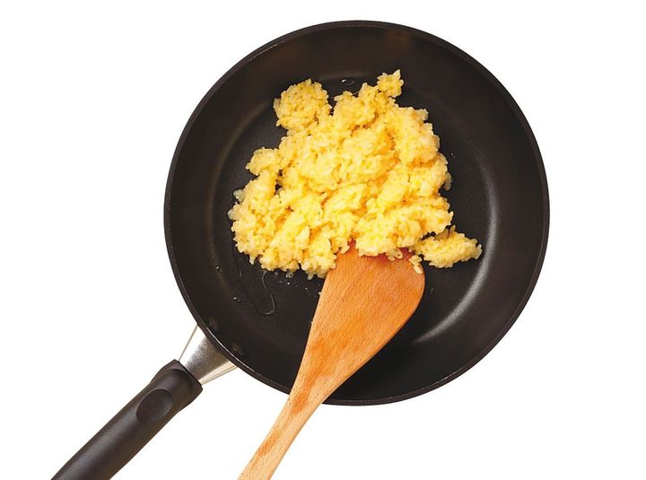 ご飯に卵を「はじめに混ぜちゃう」ことで、米粒1つ1つに卵がコーティングされます。それを加熱すると……米粒どうしがくっつかないでパラパラに! レンゲorスプーン必須で、おめし上がりください。