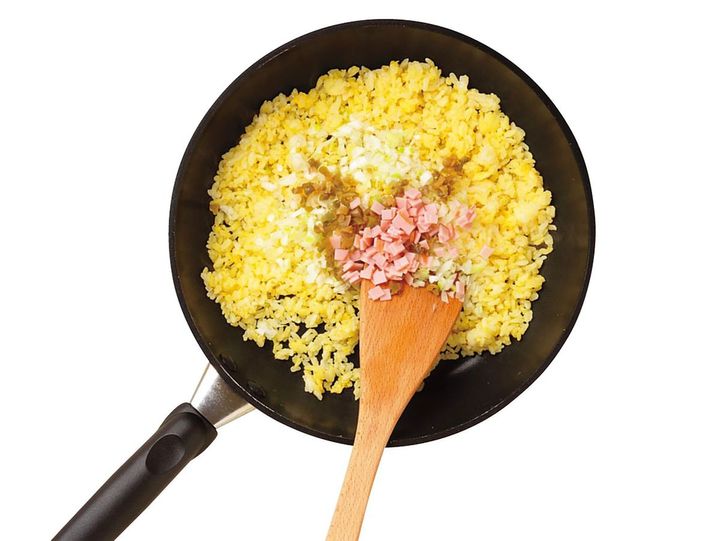 ハム、ねぎ、ザーサイを加え、全体に油がなじむまで1分ほど炒める。