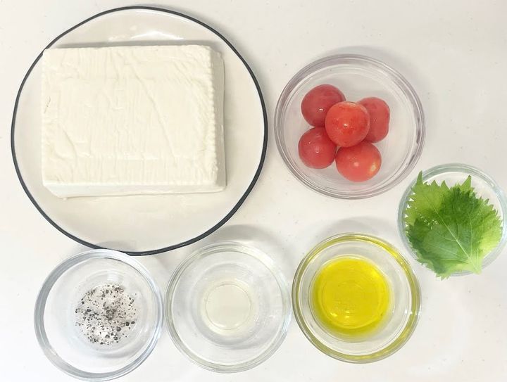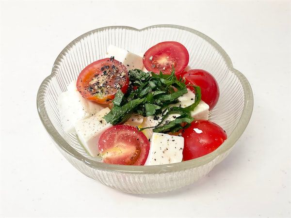 4. 3の塩豆腐をサイコロ状に切り、ミニトマトを半分に切り、器に入れます。そこにオリーブオイルとレモン汁と和えたものをかけ、青じそ、ブラックペッパーをかけたらカプレーゼの出来上がり!