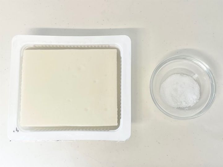 1. 豆腐の側面全体に塩を残さないようにすべてまぶします。