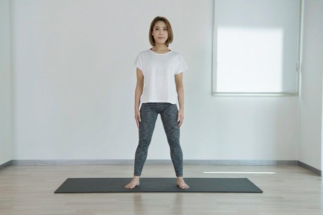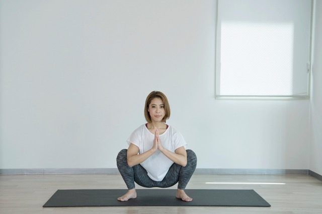 (3)しゃがみきったら胸の前で合掌をし、ひじとひざを軽く押し合ってゆっくり3〜5呼吸(約30秒間)キープする