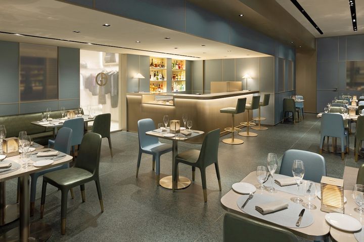 ミニマルな美学を追求したブティックは、ベージュゴールドを基調とし、ブルー、グリーン、ゴールドカラーをアクセントカラーに採用。1階にはメンズウェアやレザーグッズ、アイウェアコレクションが、2階にはイブニングドレスを含むウィメンズウェアやアクセサリー、ファインジュエリー、香水、時計などアルマーニを代表するアイテムがラインナップ。