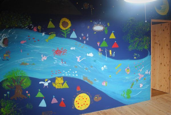 こちらは「えそらごと」という名前の客室です。定員3名。 春夏の天降川源流の様子を描かれています。