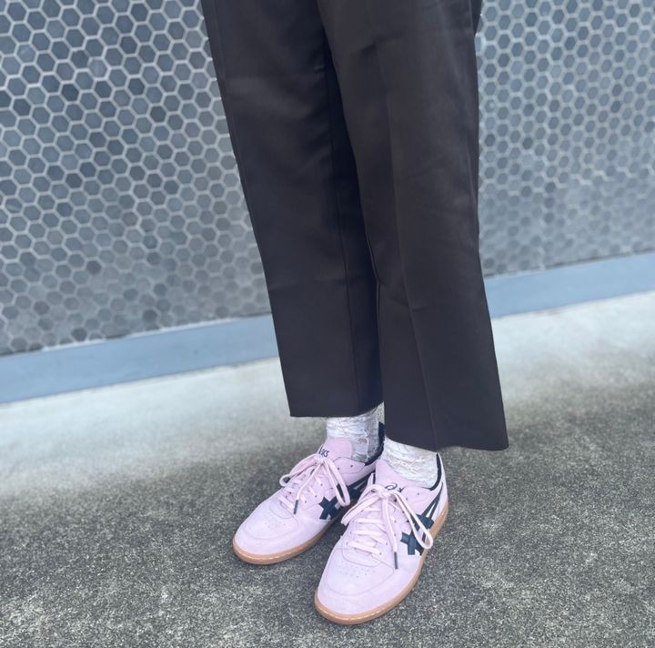 ダークブラウンのワークパンツに白レースのソックス、そしてピンクのスニーカーというミックス感ある足元がお気に入り♡