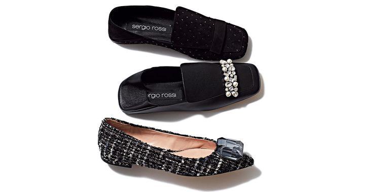 フラットだから無理なく、毎日でも「アガる」足元を叶えてくれる。ラインストーンシューズ[H0.5㎝]¥161,700パールビジューシューズ[H0.5㎝]¥171,600(ともにセルジオ ロッシ/セルジオ ロッシ カスタマーサービス)ツイードパンプス[H0.5㎝]¥174,900(ジャンヴィト ロッシ/ジャンヴィト ロッシ ジャパン)