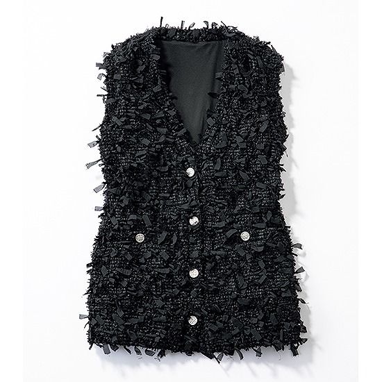 ツイード素材とリボンがミックスされたもこもこ素材がかわいいこちら。甘さを保ちつつも上品な印象も演出してくれるトレンド感のあるアイテムです。