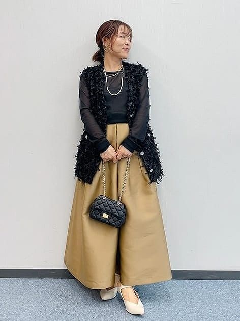 コーデを盛り上げる要素が詰まったこちらのコーディネート。裾が大きく広がったスカートにタッグインしてスタイルアップ効果もゲット。インナーをシアーにすれば主張の強いボトムスにも抜け感がプラスし、バランスの取れたスタイルに。落ち着いた色使いがシックで洗練された印象を叶えます。