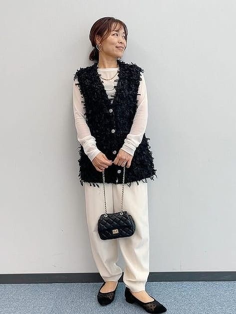 白のシアーのカットソーがブラックのツイードジレの華やかさを程よく調節。パンツもゆったりシンプルなものを選んでカジュアルモードな雰囲気を叶えます。モノトーンで統一感ある着こなしに。コンサバさんにもおすすめのコーデです。
