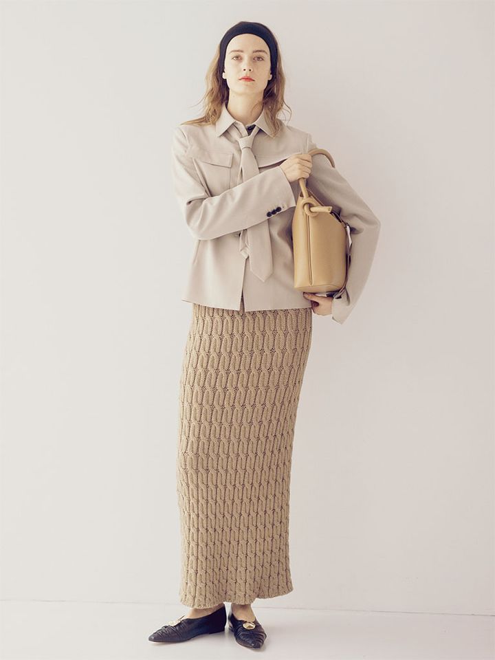 【POINT】タイトスカートのトーンをそろえてセットアップっぽく。ニュアンスや立体感を生むケーブルニットのおかげで、ワントーンのIラインシルエットも単調に見えず、よくあるコンサバ感も軽減。