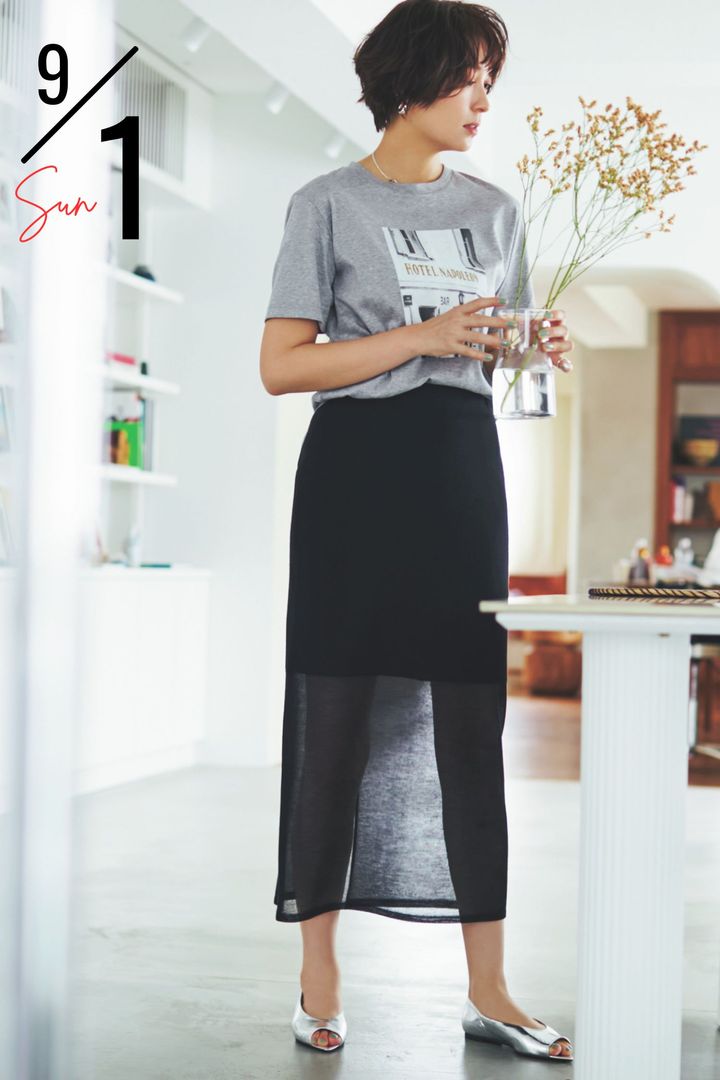 すっきりシルエットのナロースカートは、細見え効果が抜群!シアー感が今っぽいデザインなら、Tシャツとのワンツーコーデもこなれ見えが叶う。
