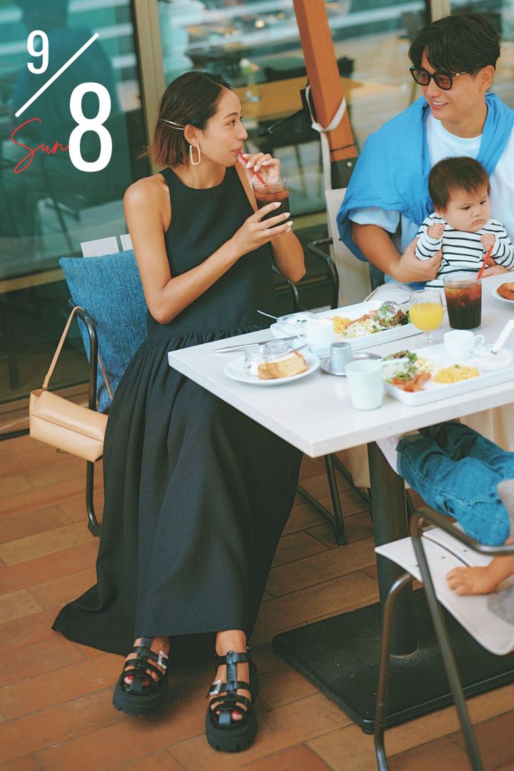 [ママ]ワンピース¥39,600(ガリャルダガランテ/ガリャルダガランテ 青山店)ピアス¥30,800(ブランイリス/ブランイリス トーキョー)バッグ¥55,000(ミウール/ショールーム セッション)サンダル¥174,900(セルジオ ロッシ/セルジオ ロッシ カスタマーサービス)[パパ]Tシャツ※2枚組¥13,200(エイトンステイプルズ)肩がけしたシャツ¥39,600パンツ¥49,500(ともにATON/エイトン青山)[長男]Tシャツ¥1,990オールインワン¥6,990(ともにGapKids)[次男]セットアップ¥4,990(babyGap)その他/スタイリスト私物