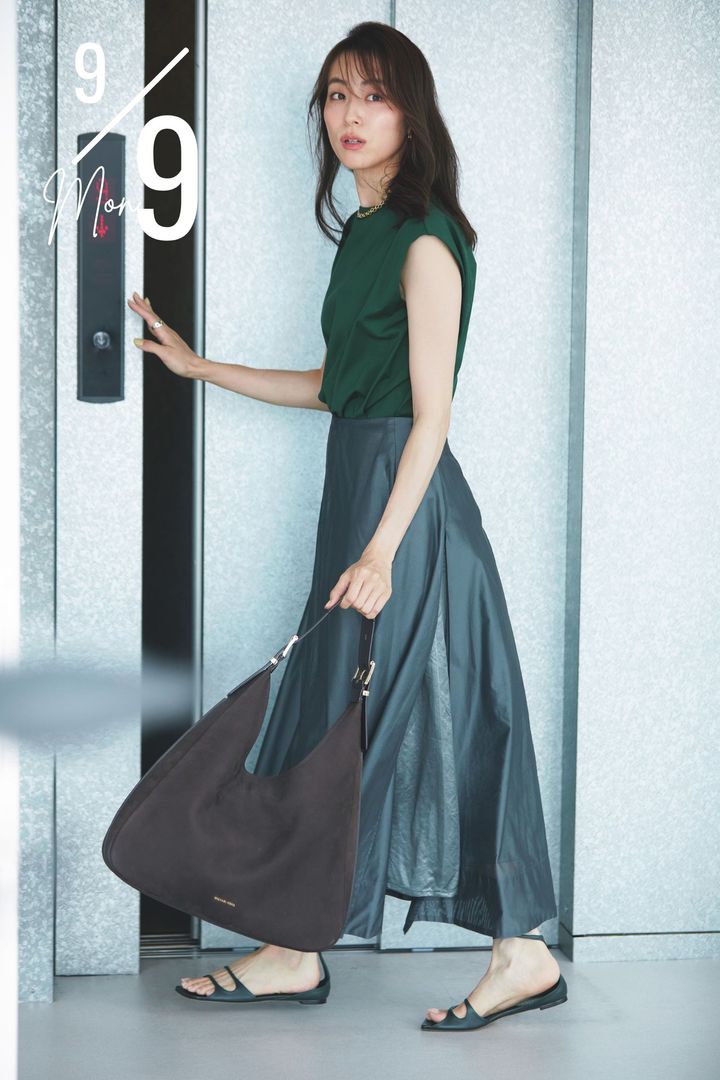 まだまだノースリーブが手放せない端境期は、艶感のあるスカートを投入!全体を落ち着いたトーンでまとめれば、通勤や行事にも対応できる秋めきコーデが完成。