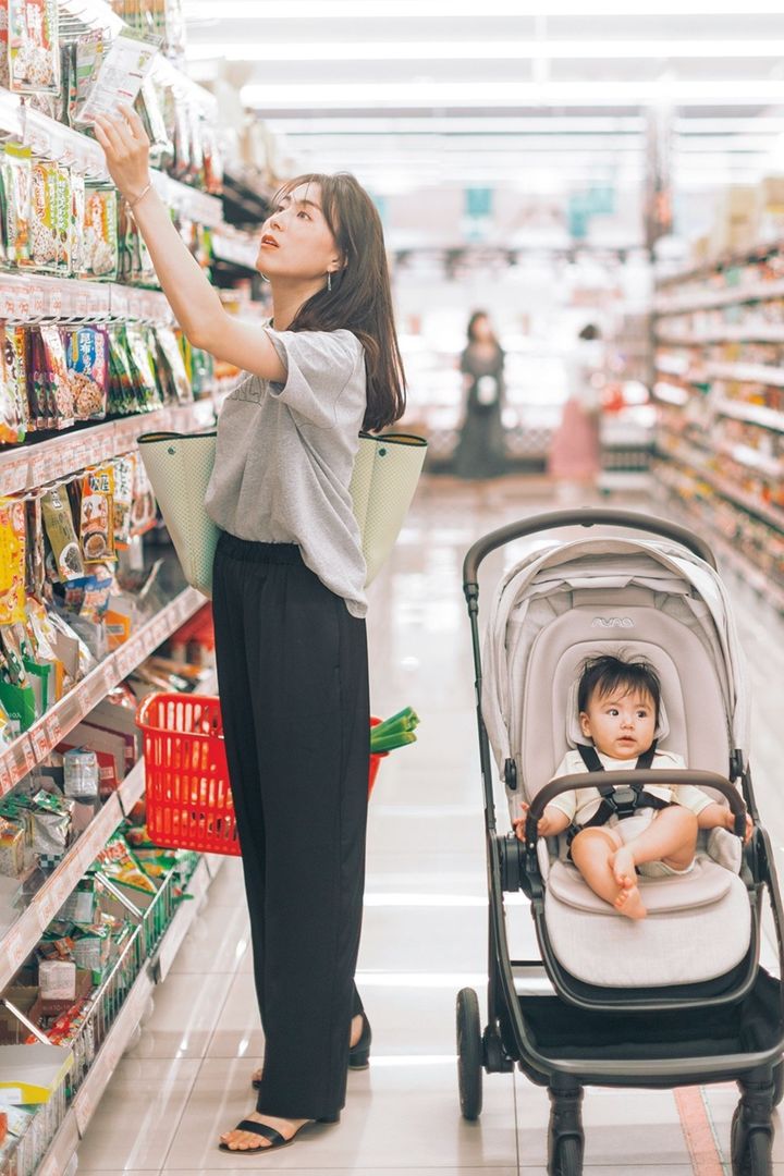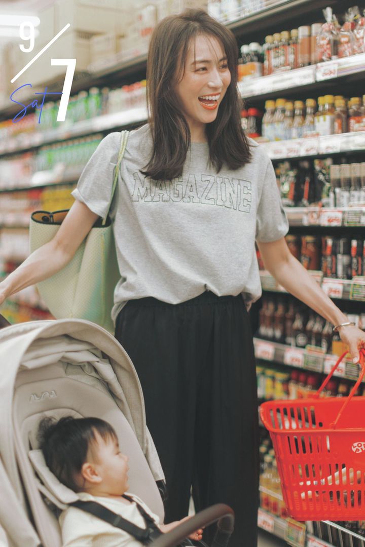 Tシャツ¥10,450※2枚セット(サードマガジン)パンツ¥19,800(レイ)ピアス¥20,900(ヴイエー ヴァンドーム青山/ヴイエー ヴァンドーム青山 有楽町マルイ店)バングル¥24,200(ete)バッグ¥58,300(ステート オブ エスケープ/リトルリーグ)サンダル¥46,200(KATIM)[子ども]ロンパース¥8,800(ロンハーマン)ベビーカー¥94,380(ヌナ/カトージ)
