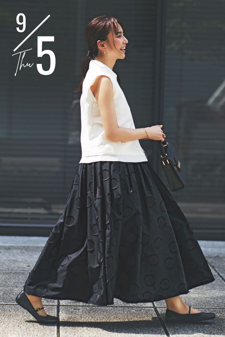 何でもない通勤や送迎も、気分を上げてくれる主役級フレアスカート。甘デザインこそモノトーンでまとめるのが正解!どんなシーンにも馴染むきちんと感をキープできる。