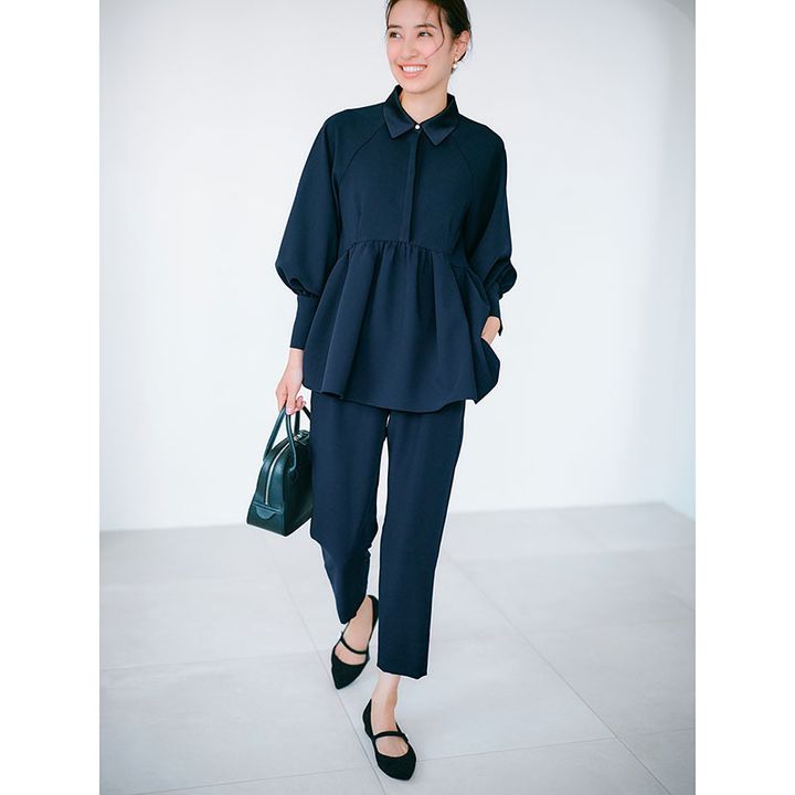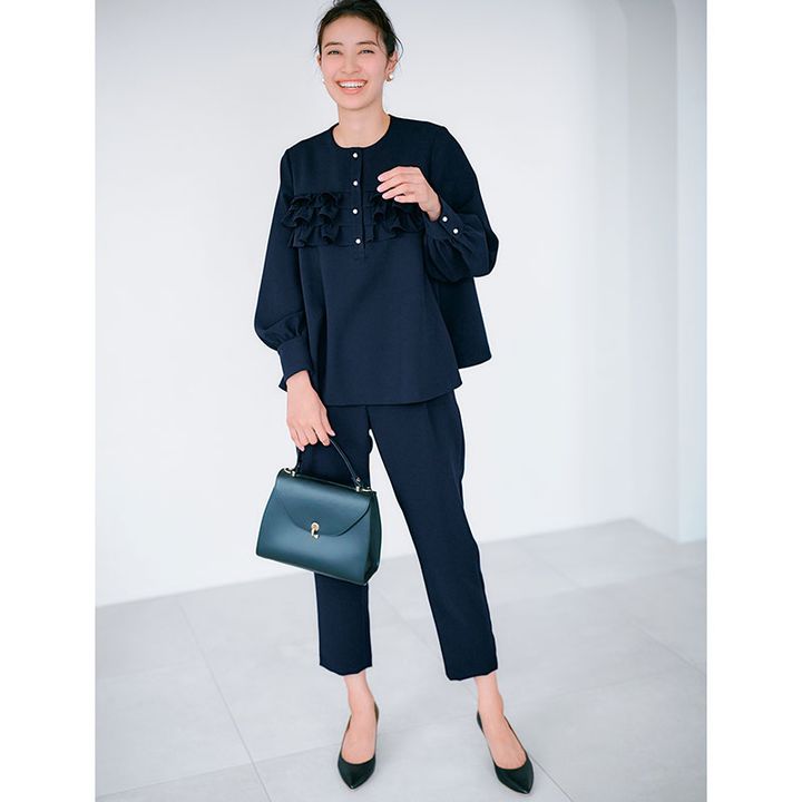 ブラウス¥22,000パンツ¥17,600(ともにソーノネイビー/ミラク)イヤリング¥7,560(アビステ)バッグ¥38,500(ジャンニノターロ×デミルクスビームス/デミルクスビームス新宿)パンプス¥17,050(ダイアナ/ダイアナ銀座本店)
