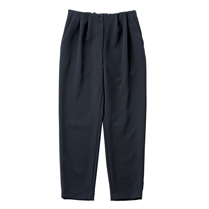 スリムテーパードシルエット。ウエストはゴムを織り込んだ仕様。2サイズ展開。3つのトップスと共通素材のほどよく肉厚な防シワダブルクロス。