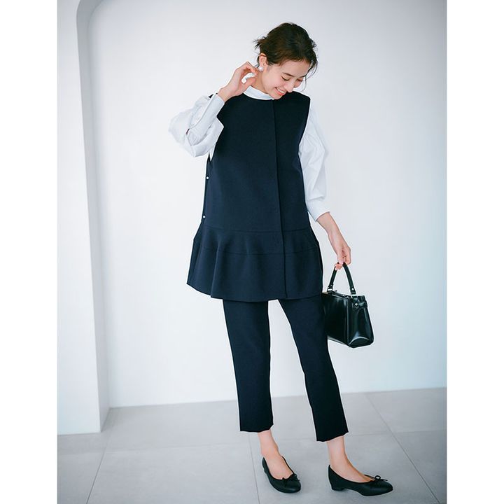 ジレ¥28,600パンツ¥17,600(ともにソーノネイビー/ミラク)ブラウス¥37,400(Sov./フィルム)イヤリング¥7,020(アビステ)バッグ¥35,200(ジャンニノターロ/デミルクスビームス新宿)靴¥15,400(ダイアナ/ダイアナ銀座本店)