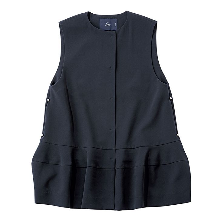 インナー次第で汎用性の高いジレは、季節問わず使えて便利。肩先が少し腕にかかる袖丈もきちんと感をUP。ヒップまでしっかりカバーする78cm丈で、切り替えによる構築的なポタリーヘムが特徴。後衿中心にはサテンリボン、サイドには小粒パール。