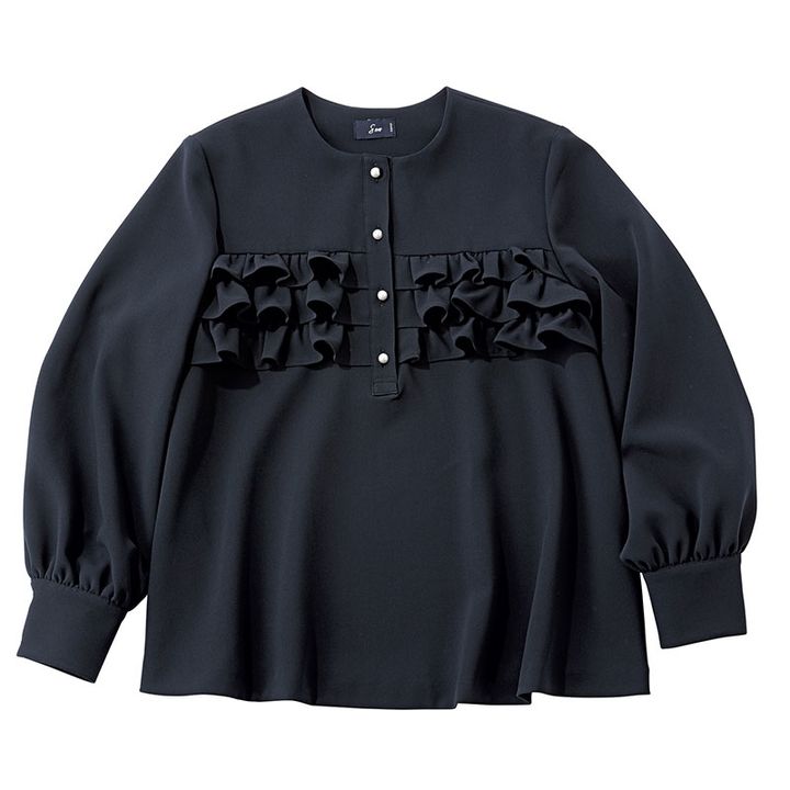 胸元の装飾で目線が上がりスタイルアップ。フリルもパールもさりげないから、きちんと感を損ないません。少し高めにつけたフロントの3段フリルによってスタイルアップ。フロントとカフスにはパールボタン。ウエストアウトで着ても上品な丈。