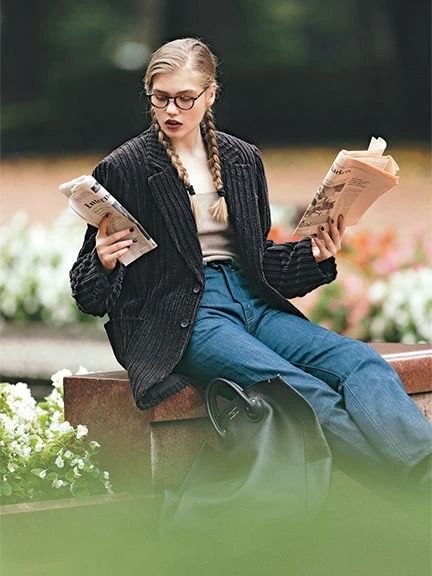 「ポイントは太いうねによる重厚感。ストライプのようなニュアンスが加わりつつも、ストライプのように目立たない品の良さ。秋からもジャケットはビッグシルエットが気分。似合う色の幅も広い、ビターな色味のブラウンなら着回しやすく、黒のように引き締まって見えつつも、強くなりすぎないので1着あると重宝します」(渡邉恵子さん)