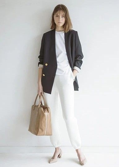 「キレイに穿けるスエットパンツは、秋からもますます欠かせない主役ボトムの1つ。そのラフな素材感を生かし、これからはかっちりとしたジャケット、ヒールパンプスにレザーバッグと、素材以外はまじめに徹した装いに。白&ネイビー配色ならさらに大人っぽく都会的なムード」(樋口かほりさん)