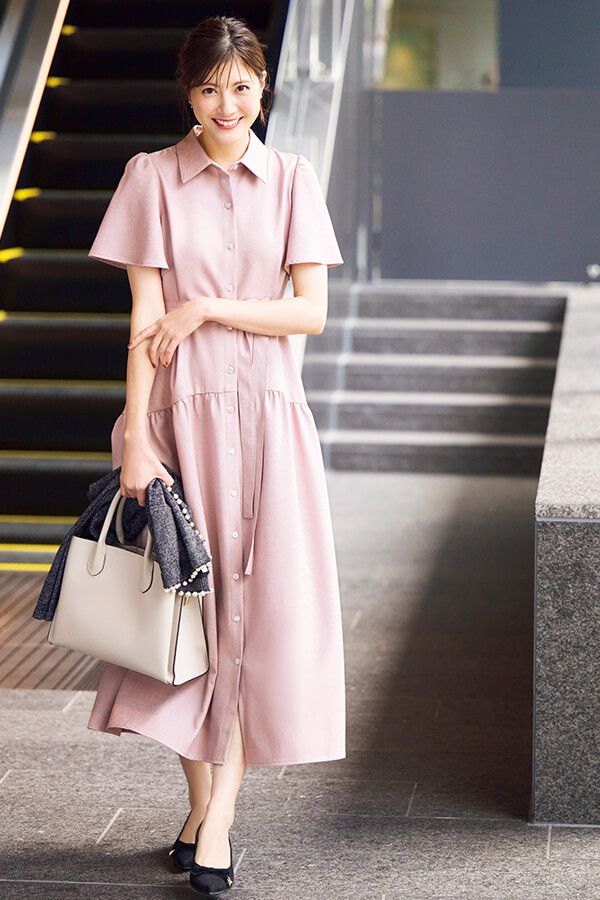 3. 1枚で清楚コーデが完成♡くすみピンクのシャツワンピでつくる華やぎ通勤スタイル