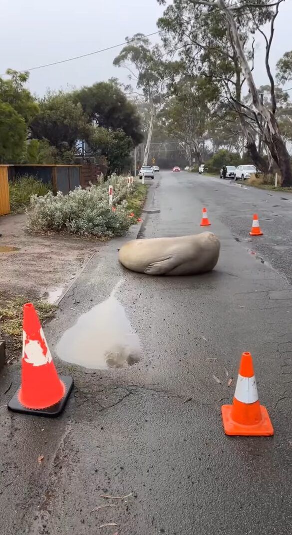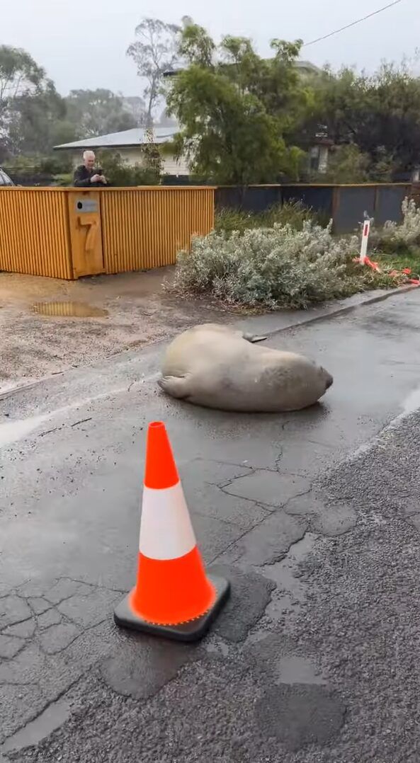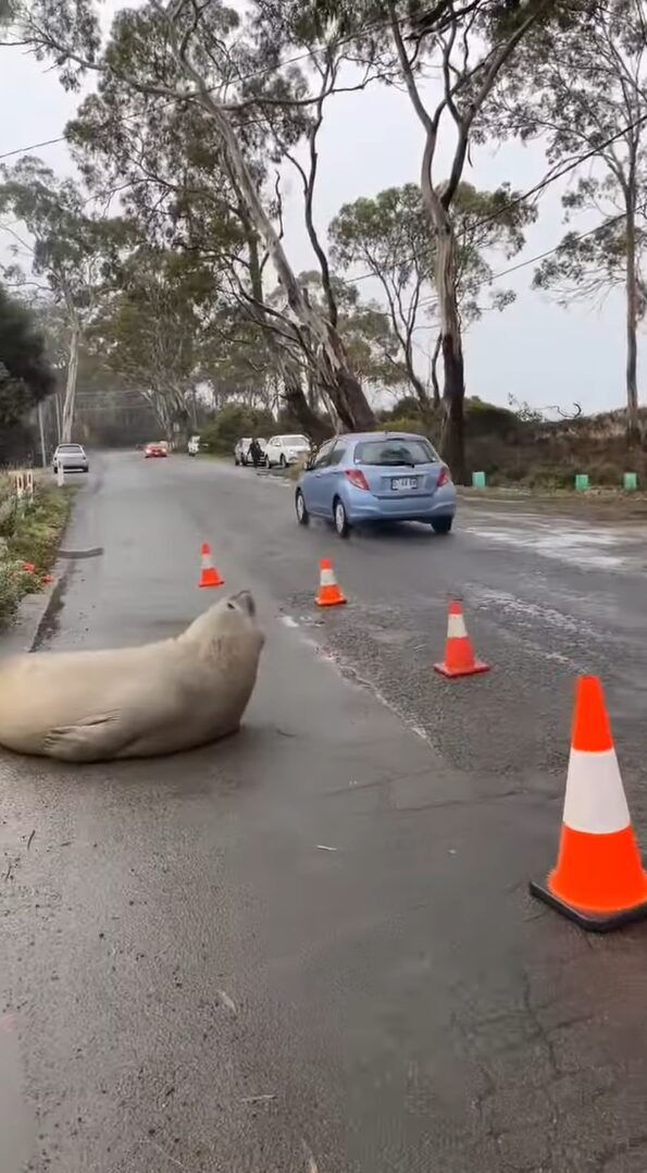3. 道路が一部閉鎖中!落石があったのかと思いきや・・岩ではなくアザラシだ!!【海外・動画】