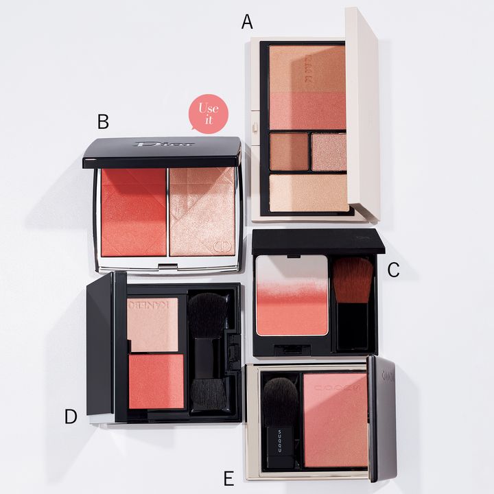 A:ピーチコーラルのチークをはじめ、ハニーグロウのハイライトカラーなどをセット。ウォームトーンで揃えた5色入りマルチパレット。RMK シェイド&グロウ フェイスパレット 02 ¥7,700※7/26発売(RMK Division)B:コーラルマットとピンクグロウでフレッシュな印象を与える。柔らかな発色と光のレイヤードで濃淡の調整も思いのまま。ディオールスキン ルージュ ブラッシュ カラー&グロウ 457 ¥8,470(パルファン・クリスチャン・ディオール)C:アマリリスの花のような温かみのあるコーラルと、透明感を仕込むクリアなハイライトのグラデーション。潤いに満ちた艶やかな仕上がりに。ポーラ B.A 3Dオアシス ブラッシュ 01 ¥6,050※8/1発売(ポーラ)D:くすみのないコーラルと肌馴染みの良いベージュハイライトがイン。混ぜても濁らず、華やかで奥行きのある顔立ちを叶える。カネボウ ムードブースティングブラッシュ 02 カスタムコンパクト・フェイスブラシセット ¥5,830※7/26発売(カネボウインターナショナルDiv.)E:ニュートラルピンクとヌーディなベージュハイライトの組合わせ。しっくり馴染むベーシックな色合い。SUQQU ブラーリング カラー ブラッシュ 03 ¥6,600※7/19発売(SUQQU)