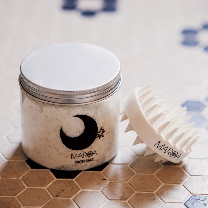 リラックスできる香りで良質な睡眠へと導く。MAROA ナチュラルバスソルト ラベンダースイートオーレンジ SLEEP 450g ¥4,620 スカルプケアブラシ¥2,310(ともにme)