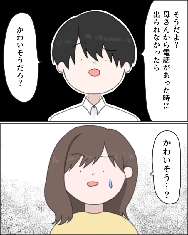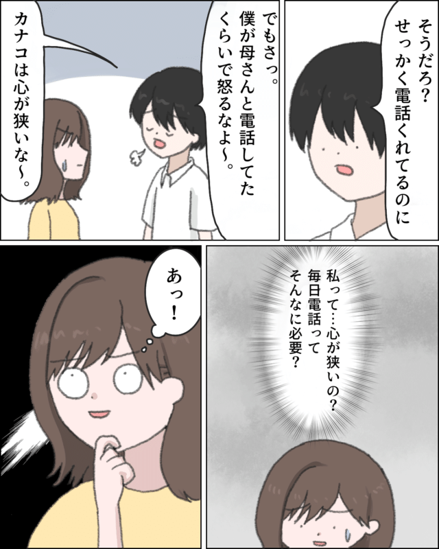 思わず「かわいそう?」と聞き返したカナコさんに、ユウタさんは当然のように「そうだろ?せっかく電話くれてるのに。」と言い、「僕が母さんと電話してたくらいで怒るなよ~。カナコは心が狭いな」と言われてしまいました。「私って心が狭いの?毎日電話ってそんなに必よう?」と疑問ばかりが残るカナコさんです。