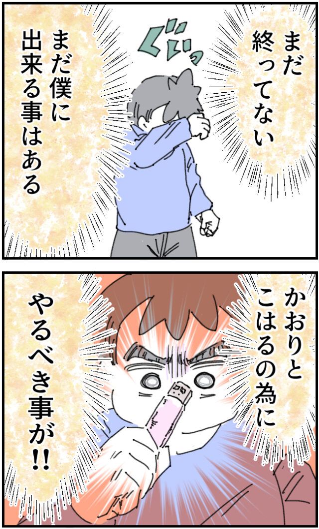 「まだ終わってない。まだ僕にできる事はある!かおりとこはるの為にやるべき事が!!」何かを握りしめ決意に満ち溢れていました。