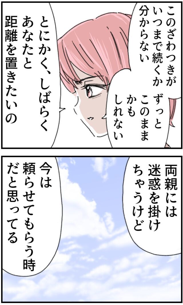 「このざわつきがいつまで続くかわかならい。ずっとこのままかもしれない。とにかく、しばらくあなたと距離を置きたいの」そう言った後で、「両親には迷惑をかけちゃうけど、今は頼らせてもらう時だと思ってる」と言ったかおりさん。