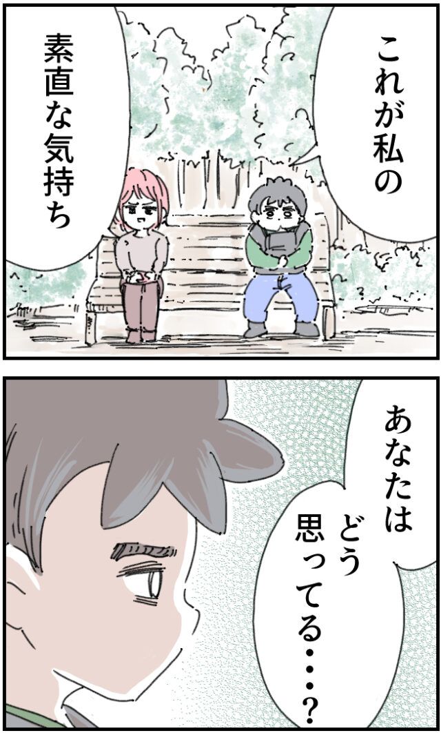 「これが私の素直な気持ち。あなたは・・どう思ってる?」かおりさんがいちろうさんにたずねました。