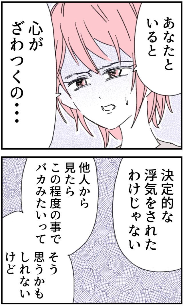 「あなたの気持ちは伝わったわ。でも『これからも一緒に頑張ろう』って言えない」そうキッパリと言い切ったかおりさんは、「あなたといると心がざわつくの・・。決定的な浮気をされたわけじゃない。他人から見たら、この程度の事でバカみたいって、そう思うかもしれないけど」と言葉を続けます。