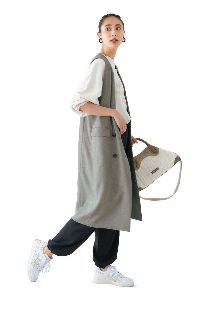 運動靴感を回避するクラシックなデザインで、脱・ほっこり。スニーカー「EX 89」¥15,400(アシックス/アシックスジャパン株式会社 お客様相談室)ジレ¥18,700(ビューティ&ユース/ビューティ&ユース ユナイテッド アローズ 丸の内店)スウェット¥14,300(ムッチ)パンツ¥39,600(ギャルリー・ヴィー/ギャルリー・ヴィー 丸の内店)バッグ¥75,900ショルダーストラップ¥12,100(ともにジャンニ キアリーニ/ジャンニ キアリーニ 銀座店)イヤリング¥2,100(アビステ)