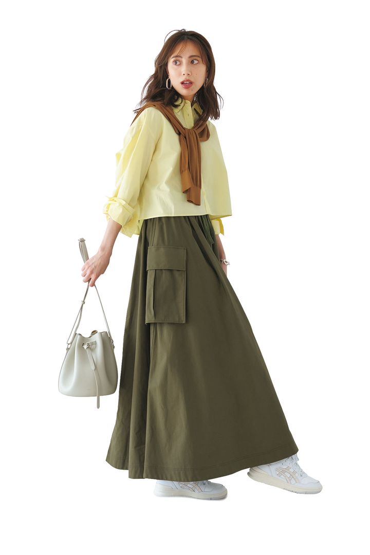 ボリュームボトムス合わせも重くならないニュアンス配色。スニーカー「EX 89」¥15,400(アシックス/アシックスジャパン株式会社 お客様相談室)シャツ¥13,750(レバー/ユナイテッドアローズ 渋谷スクランブルスクエア店)スカート¥38,500(サクラ/インターリブ)肩にかけたカーディガン¥37,400(スローン/ザ ショップ スローン 自由が丘)バッグ¥45,100(ヴァジック/ヴァジックジャパン)ピアス¥17,600ブレスレット¥24,200(ともにワンエーアールバイウノアエレ/ウノアエレ ジャパン)