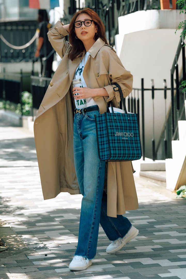 ニュアンスカラーなワントーンのスニーカーを選べば、Tシャツやデニムのカジュアル服も上品に。スニーカー「EX 89」¥15,400(アシックス/アシックスジャパン株式会社 お客様相談室)トレンチコート¥173,800(マッキントッシュ/マッキントッシュ ギンザシックス店)Tシャツ¥6,600(マイ ウィークネス)デニム¥31,900(アンスクリア/アマン)バッグ¥196,900(JIMMY CHOO)ベルト¥16,500(アルアバイル)メガネ¥62,700(アイヴァン 7285/アイヴァン 7285 トウキョウ)ピアス¥48,400ネックレス¥46,200(ともにシー/フラッパーズ)