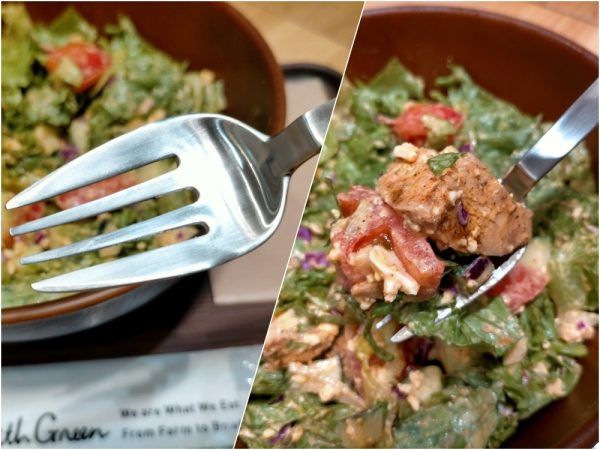 イートインなら、燕三条で製造されたWithGreenのロゴ入りの丸みのあるフォークを使うと、サラダがすくいやすくてもりもり楽しめます。