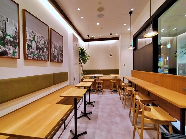 洗練されたインテリアと、ぬくもりのある木製のテーブルや椅子が素敵なイートインは14席。