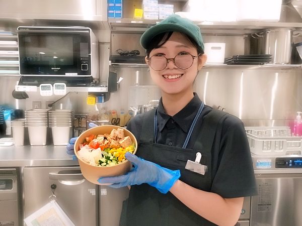 店長さんが作っているのは、人気の「ハーブチキンと彩り野菜のサラダ」のテイクアウト。