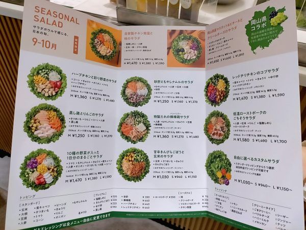 メニューに掲載されているサラダボウルに加え、トッピングや野菜を選べるカスタムサラダや、季節限定メニューもあります。