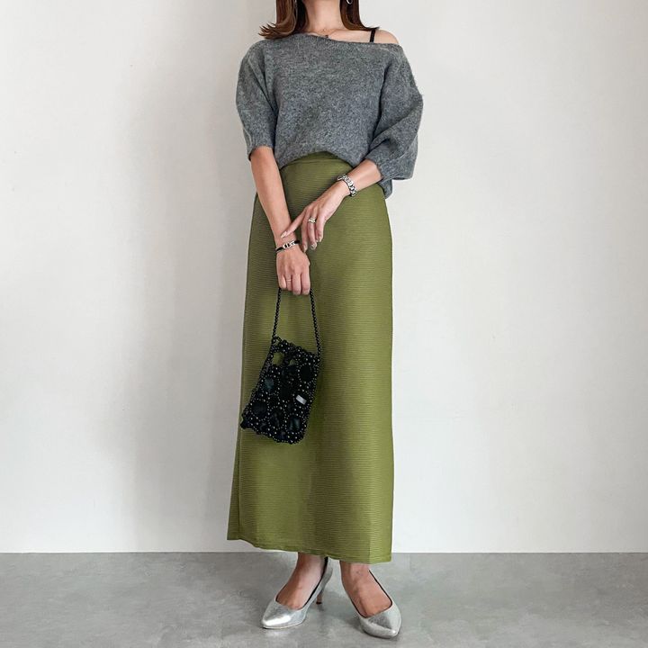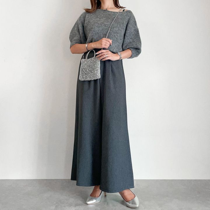 ふんわり起毛のニットトップスで、一気に秋感満載な雰囲気に。 深みのあるグレーがレディー度を高めてくれます。