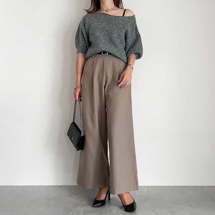 ダークグレー ✕ ベージュの、秋らしい配色でオススメ! ワイドシルエットなボトムスにワンショル合わせが、ゆったりした大人モード全開コーデに♡