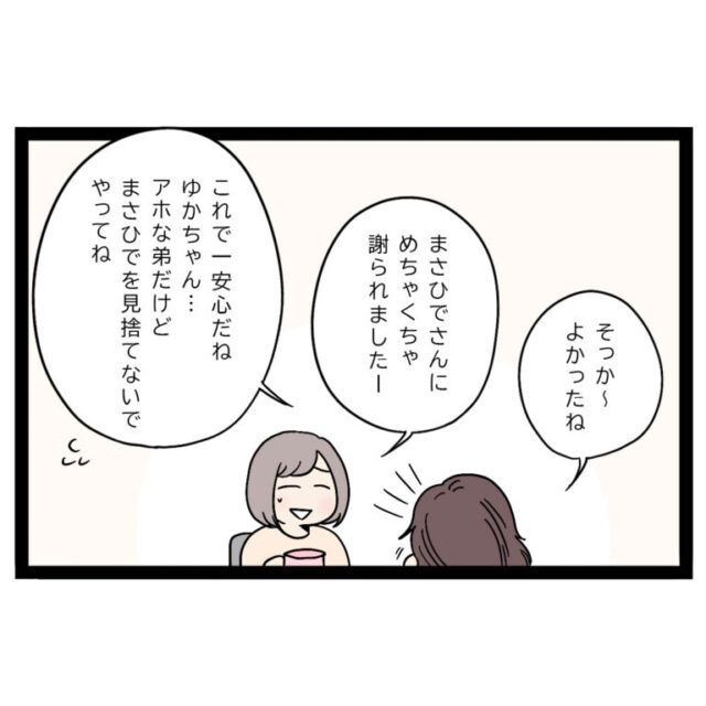 「そっか~よかったね。」と雅美さんも笑顔です。「これで一安心だね。ゆかちゃん、アホな弟だけど、まさひでを見捨てないでやってね」という雅美さんに、「まさひでさんにめちゃくちゃ謝られましたー」と笑うゆかさんです。