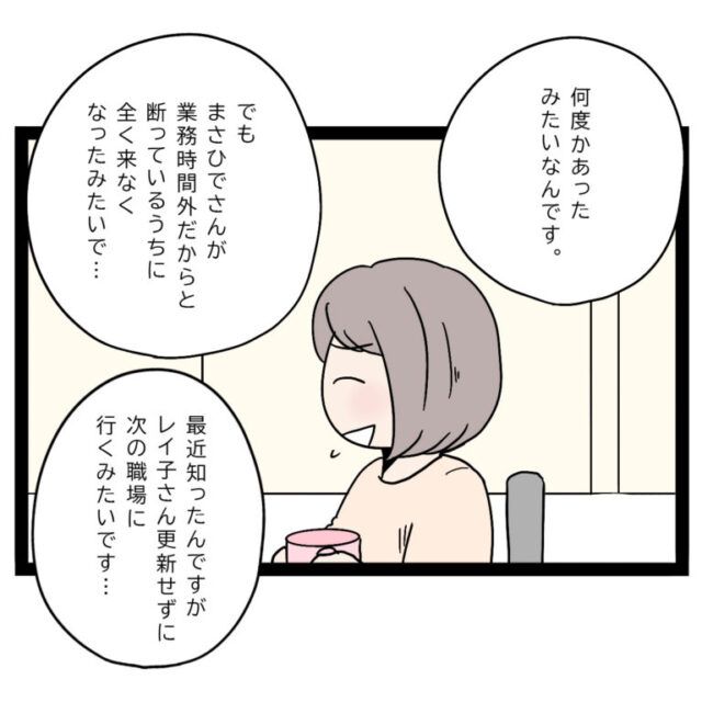 レイ子さんは「手を出さないで」と言われてキレた後も、何度かまさひでさんに連絡をしていたそうです。でもまさひでさんは、業務時間外だからと毅然とした態度で断るようになり、それを繰り返すうちにレイ子さんからの連絡は全くなくなったようです。