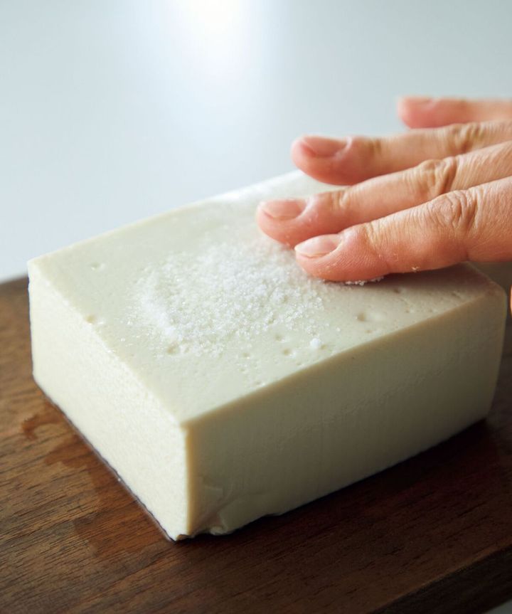 豆腐に塩をなじませながら水きりすると、食感が激変! 豆腐特有の青臭さが抜けてうまみが凝縮、ねっとりとしたクリームチーズのような食感になるんです。